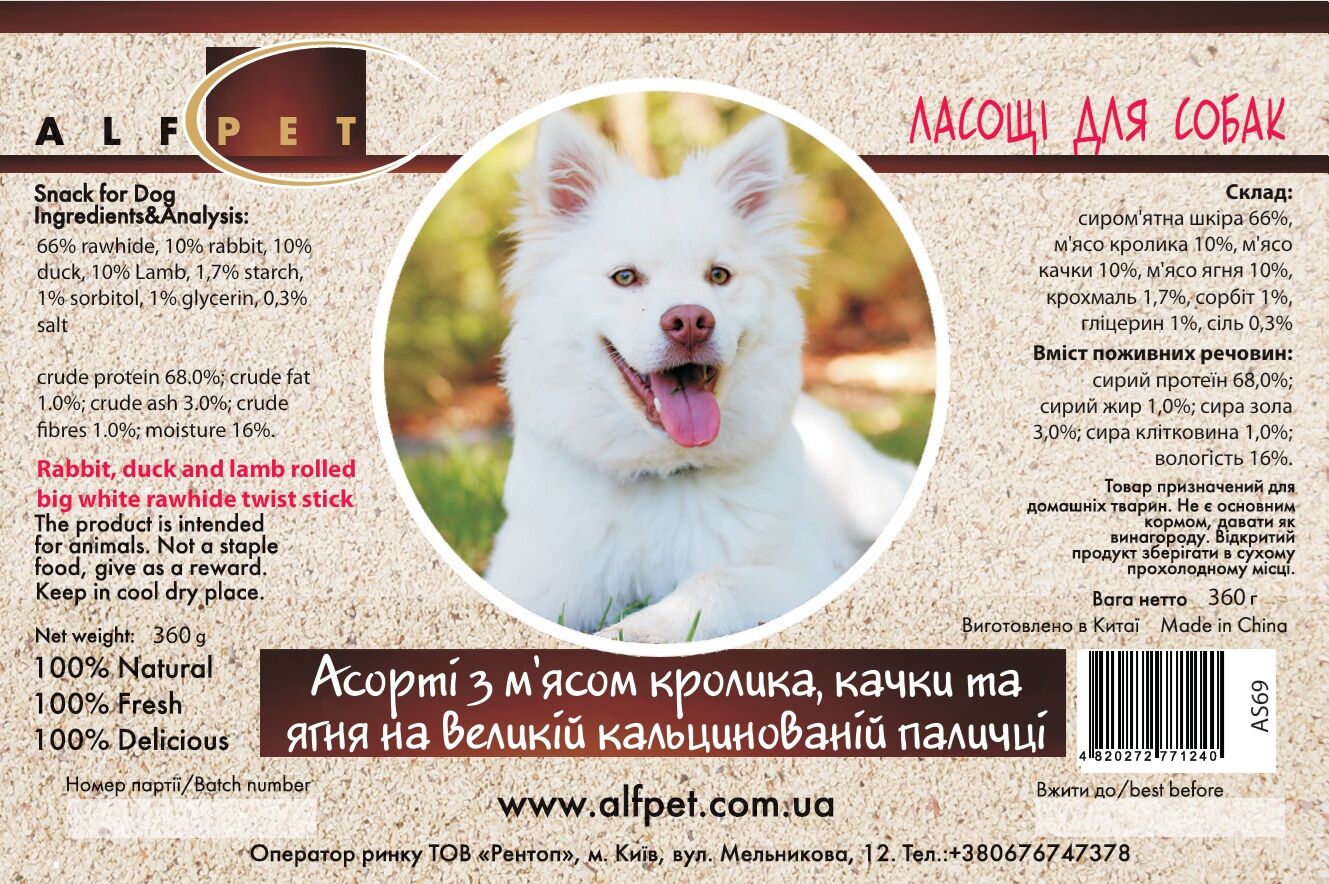 AS69 Асорті з м'ясом кролика, качки та ягня на великій кальцинованій паличці, 360 гр., ящ. 24 шт.
