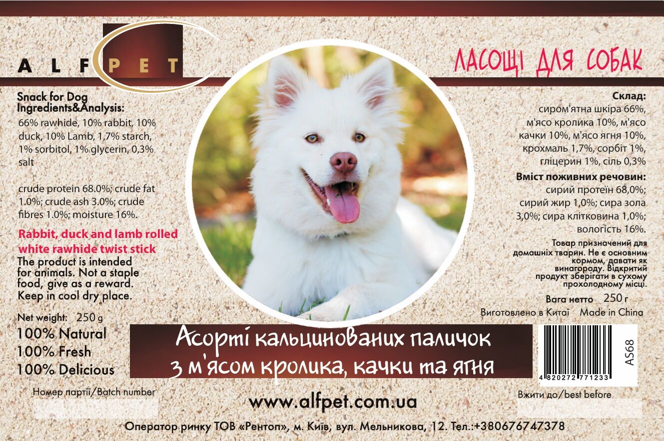 AS68 Асорті кальцинованих паличок з м'ясом кролика, качки та ягня, 250 гр., ящ. 30 шт.